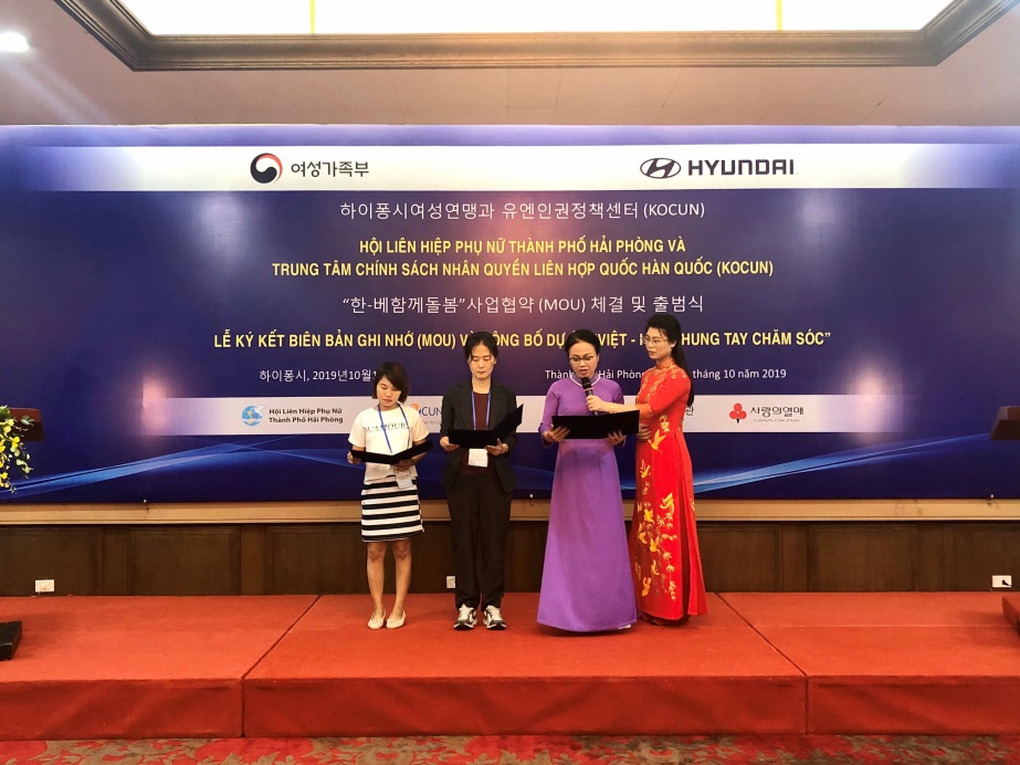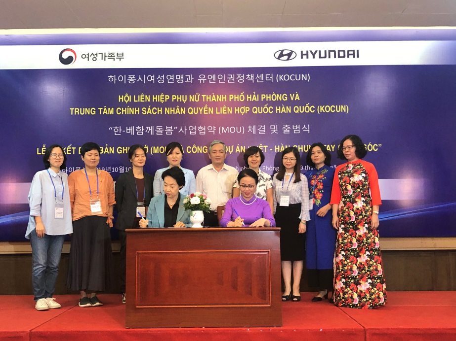 Trong những nỗ lực vì sự phát triển, tiến bộ và hạnh phúc của chị em phụ nữ nói chung và để hỗ trợ tốt hơn nữa cho các cô dâu Việt lấy chồng Hàn Quốc, Hội Liên hiệp phụ nữ thành phố đã có nhiều hoạt động, sáng kiến trong việc tiếp cận, vận động, tranh thủ nguồn lực từ các quan hệ hợp tác quốc tế để thực hiện công tác này. Qua quá trình tích cực chuẩn bị , ngày 10/10/2019, Hội Liên hiệp phụ nữ thành phố và Trung tâm chính sách nhân quyền Liên hiệp quốc Hàn Quốc (KOCUN) tổ chức Lễ ký thỏa thuận hợp tác và ra mắt dự án “Việt - Hàn chung tay chăm sóc” nhằm xây dựng, điều hành hệ thống chăm sóc tổng hợp các các gia đình đa văn hóa Việt - Hàn, đồng thời góp phần xóa bỏ những khó khăn về tinh thần, kinh tế, pháp lý mà phụ nữ di trú kết hôn và con cái của họ đang gặp phải.